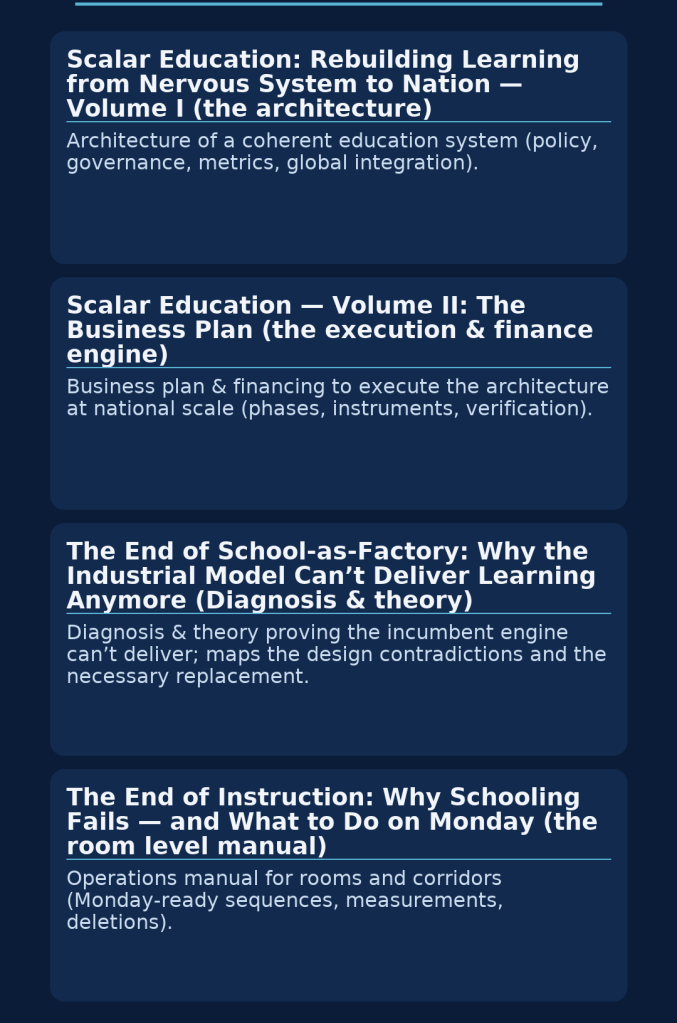 If you need to move beyond reform slogans into accountable delivery—finance aligned with learning that lasts—this book provides the instruments, sequencing, and guardrails. Precision over promise. Evidence over display. Build what works, retire what doesn’t, and let honesty compound.